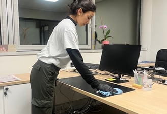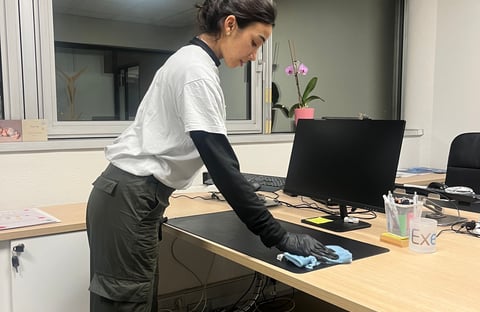 Nettoyage, dépoussiérage et désinfection du matériel informatique (écrans, claviers, souris, téléphones, câbles électriques, etc)